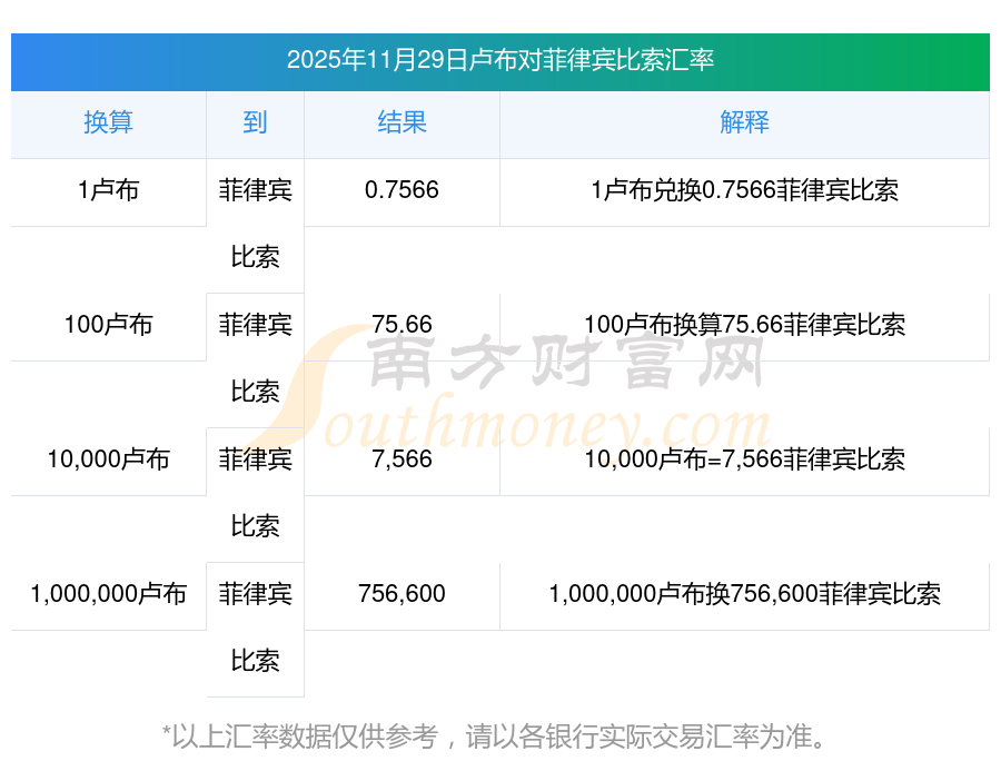 本周盧布匯率查詢,盧布對菲律賓比索匯率價多少?2025年11月29日