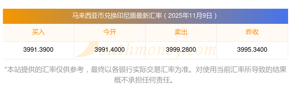 今天匯率表 130馬來(lái)西亞幣兌印尼盾匯率一覽 (2025-11-09)