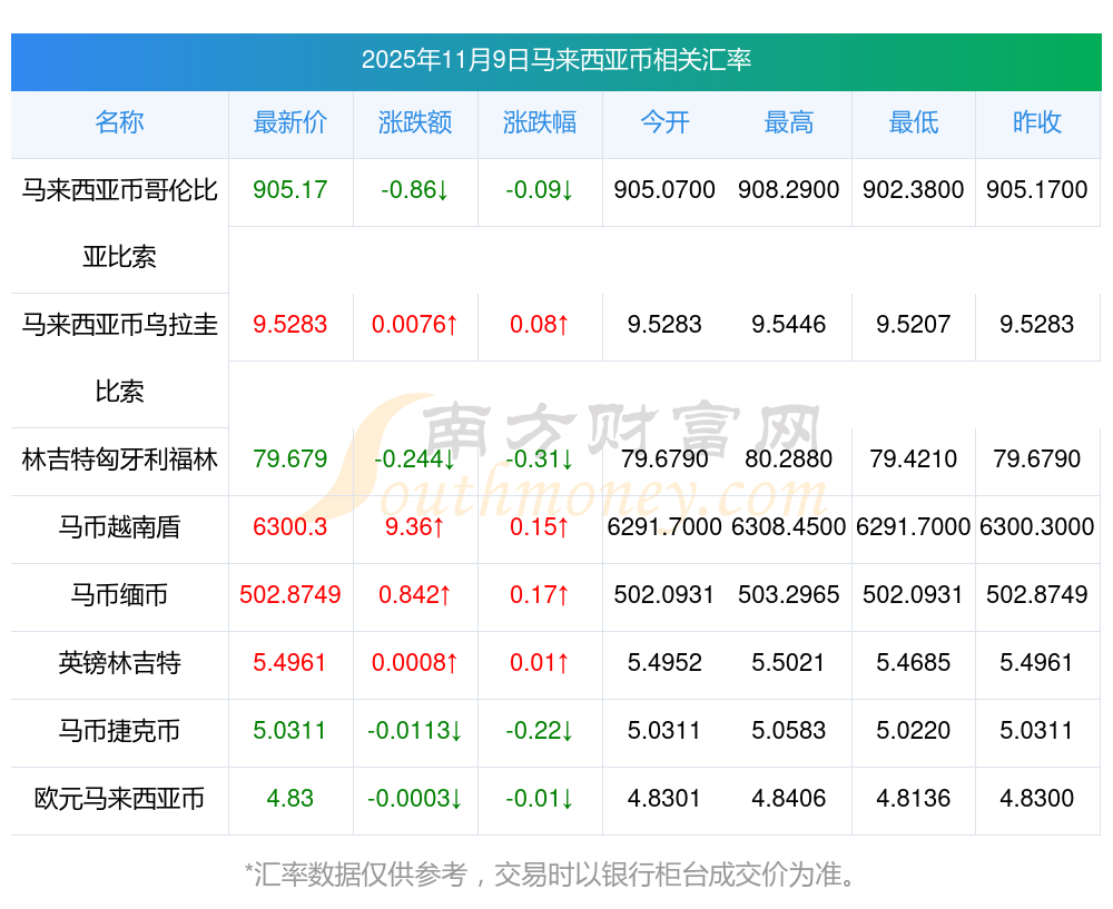 2025年11月9日馬來西亞幣相關(guān)匯率查詢