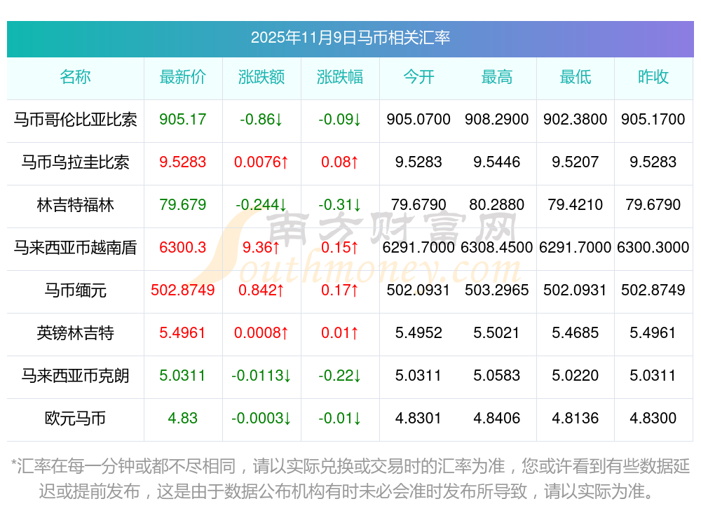 根據(jù)2025年11月9日匯率,馬幣兌換摩洛哥迪拉姆匯率最新價(jià)2.217500,今開價(jià)2.2191,昨收價(jià)2.2175,最高價(jià)2.2264,最低價(jià)2.2160。