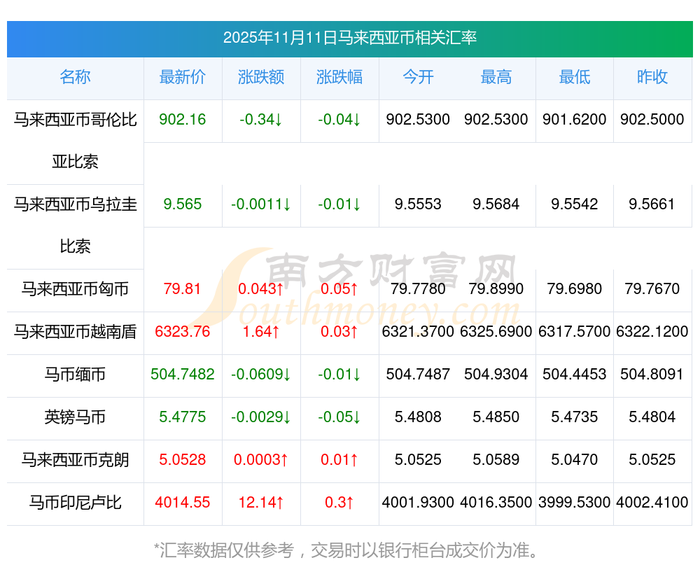2025年11月11日馬來(lái)西亞幣相關(guān)匯率查詢(xún)