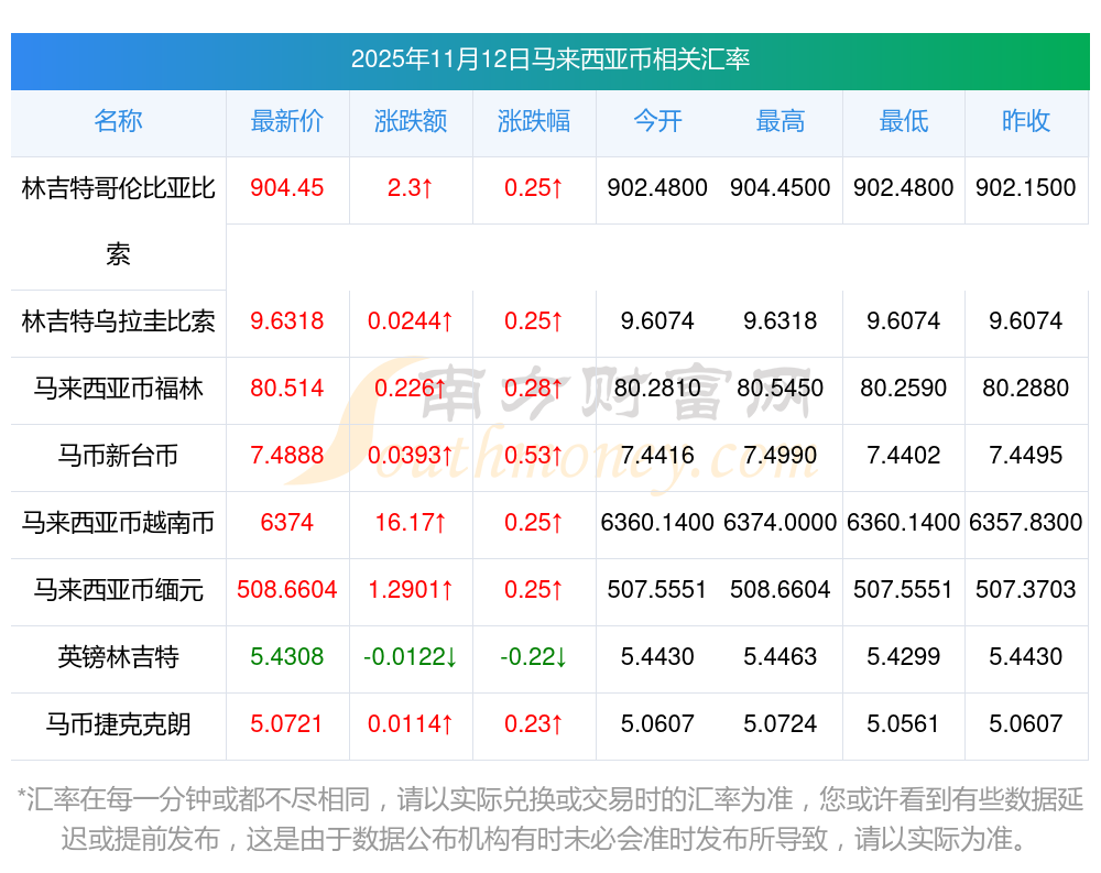 根據今天2025年11月12日匯率計算,MYR兌換CHF匯率最新價0.194180,今開價0.1934,昨收價0.1934,最高價0.1943,最低價0.1933。