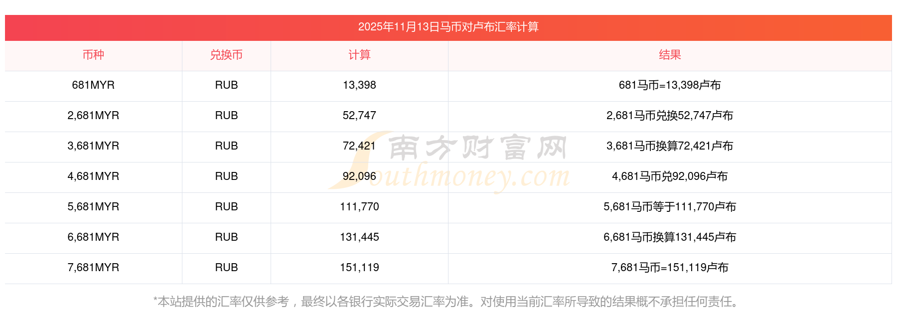 匯率今日換算:53馬幣對(duì)換盧布匯率是多少2025年11月13日