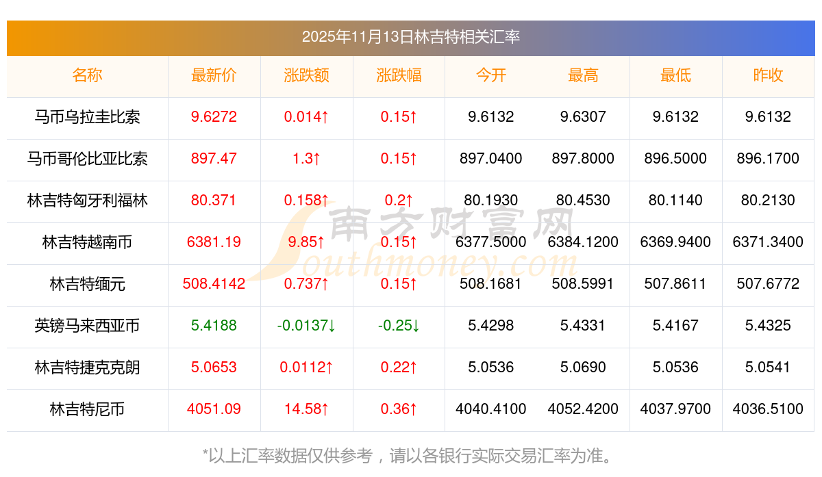2025年11月13日林吉特相關(guān)匯率查詢