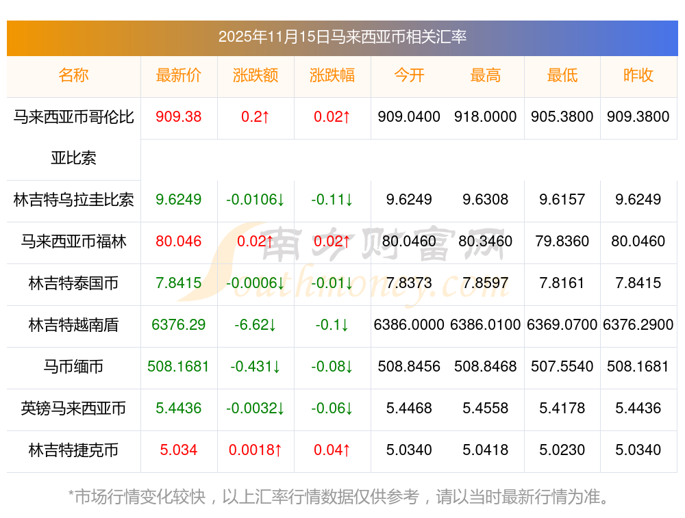 2025年11月15日馬來(lái)西亞幣相關(guān)匯率查詢