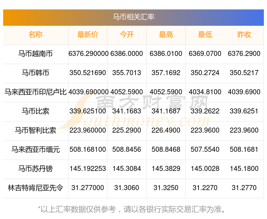 南方財富網(wǎng)為您提供馬幣對智利比索匯率最新價格詳情。