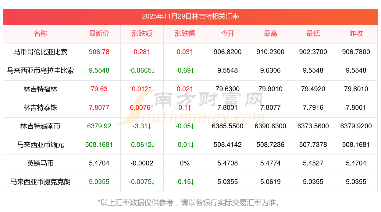 2025年11月29日林吉特相關(guān)匯率查詢(xún)