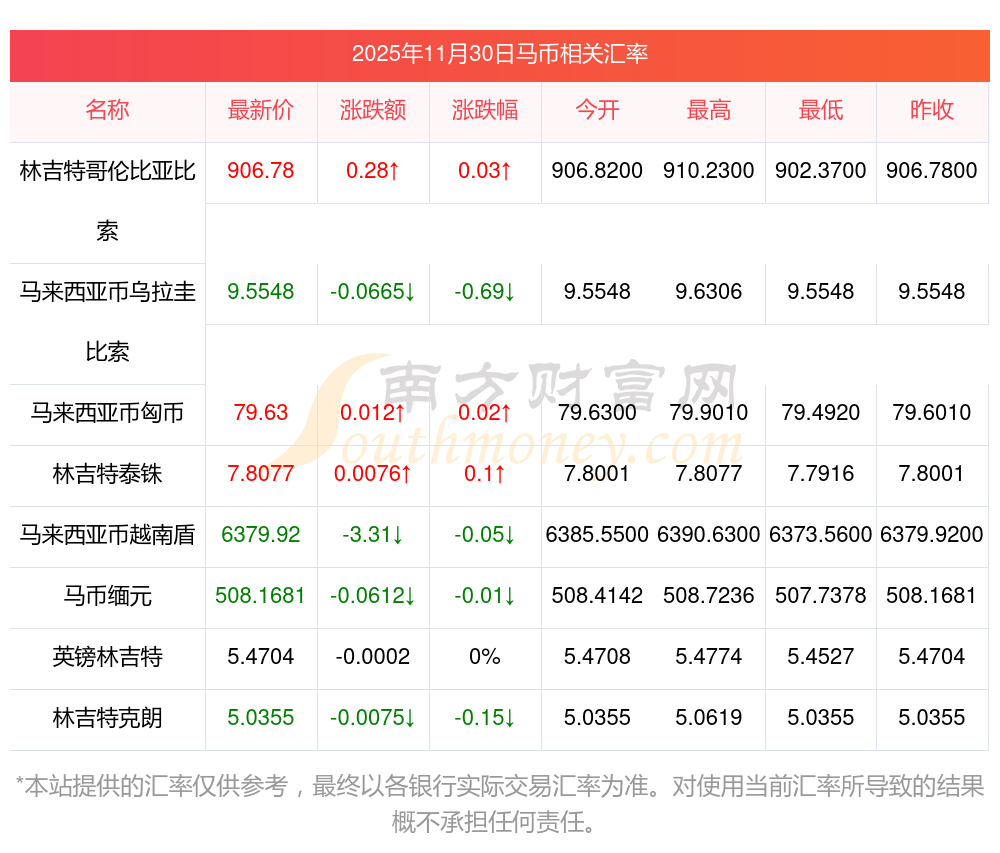 2025年11月30日馬幣相關匯率查詢