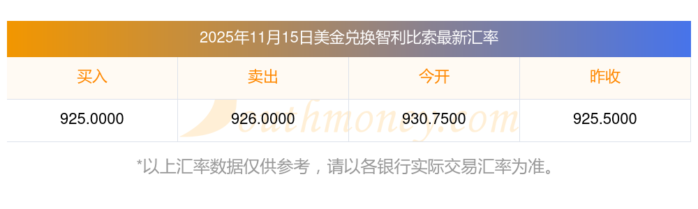 2025年11月15日美金兌換智利比索匯率是:925.5