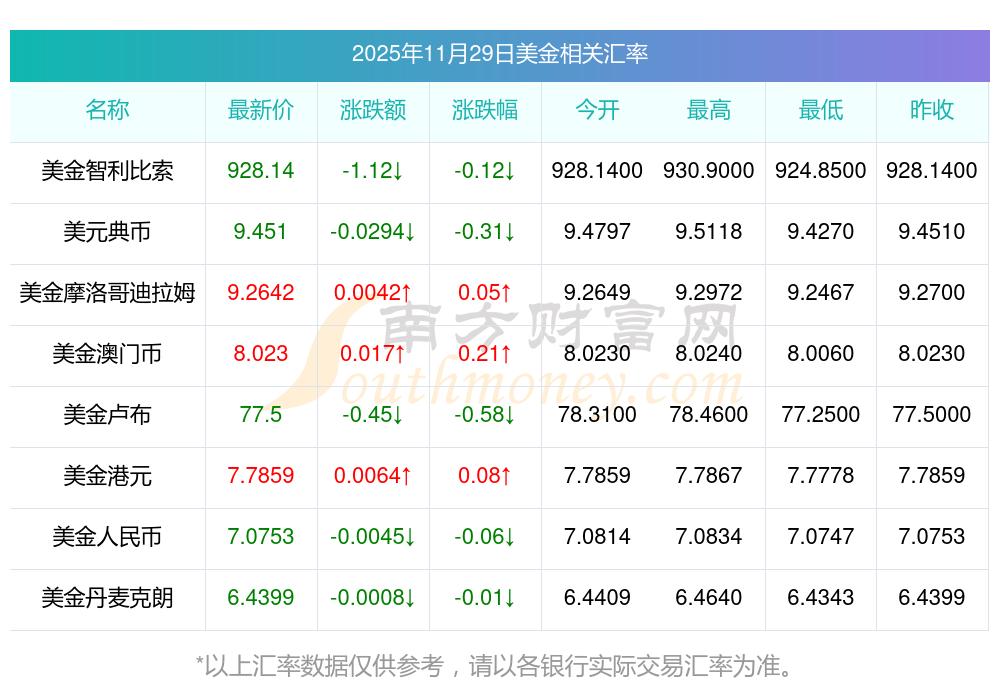 根據(jù)2025年11月29日匯率,美金兌換歐元匯率最新0.862366,今開0.8624,昨收0.8624,最高0.8654,最低0.8615。