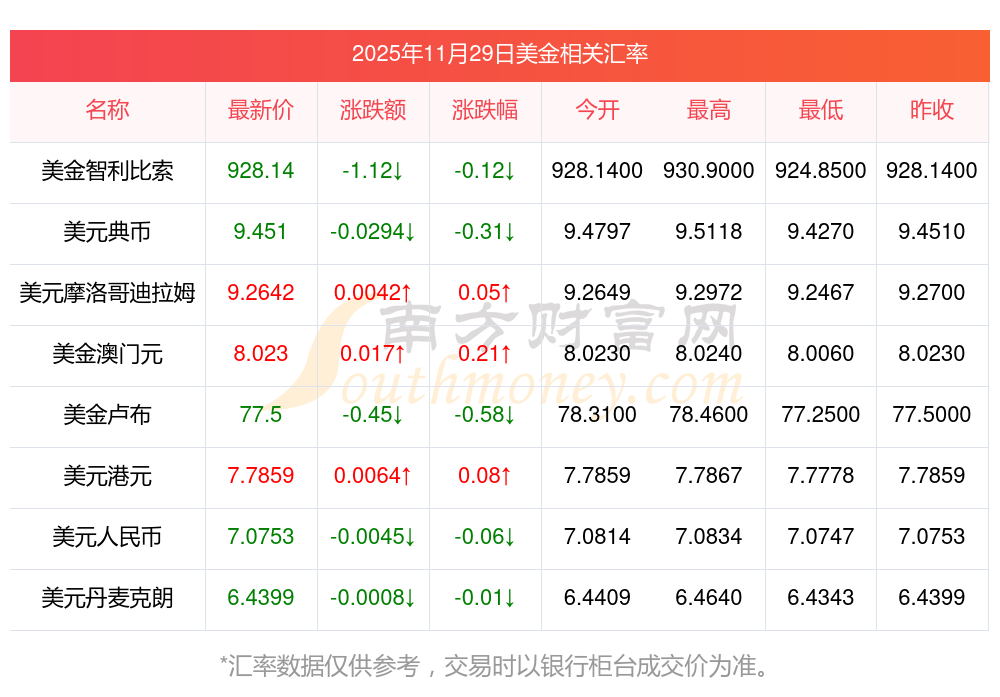 2025年11月29日美金相關(guān)匯率查詢