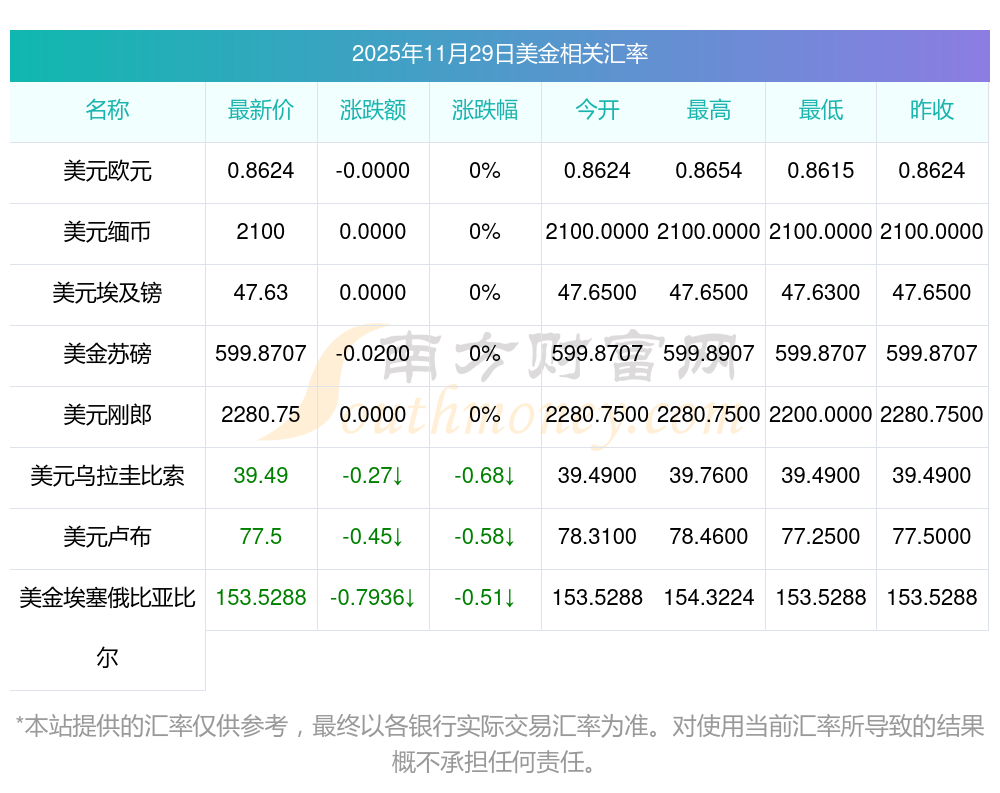 2025年11月29日美金相關(guān)匯率查詢