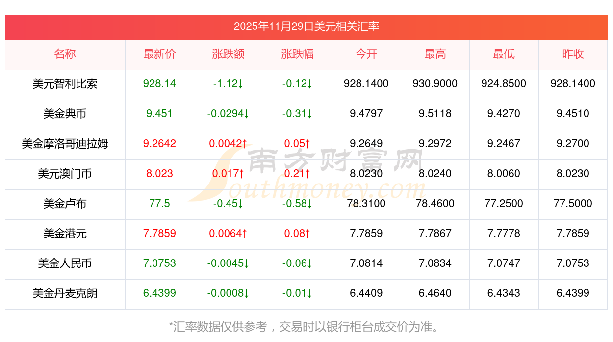 根據(jù)2025年11月29日匯率,美元兌換墨幣匯率最新價(jià)18.295000,今開價(jià)18.2950,昨收價(jià)18.3000,最高價(jià)18.3870,最低價(jià)18.2908。