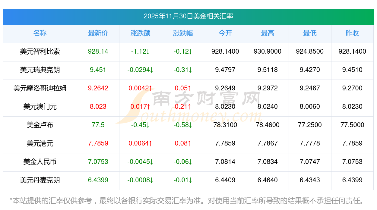 根據(jù)2025年11月30日匯率,美金兌換烏拉圭比索匯率最新價(jià)39.490000,今開價(jià)39.4900,昨收價(jià)39.4900,最高價(jià)39.7600,最低價(jià)39.4900。