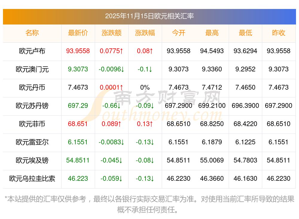 2025年11月15日歐元相關(guān)匯率查詢