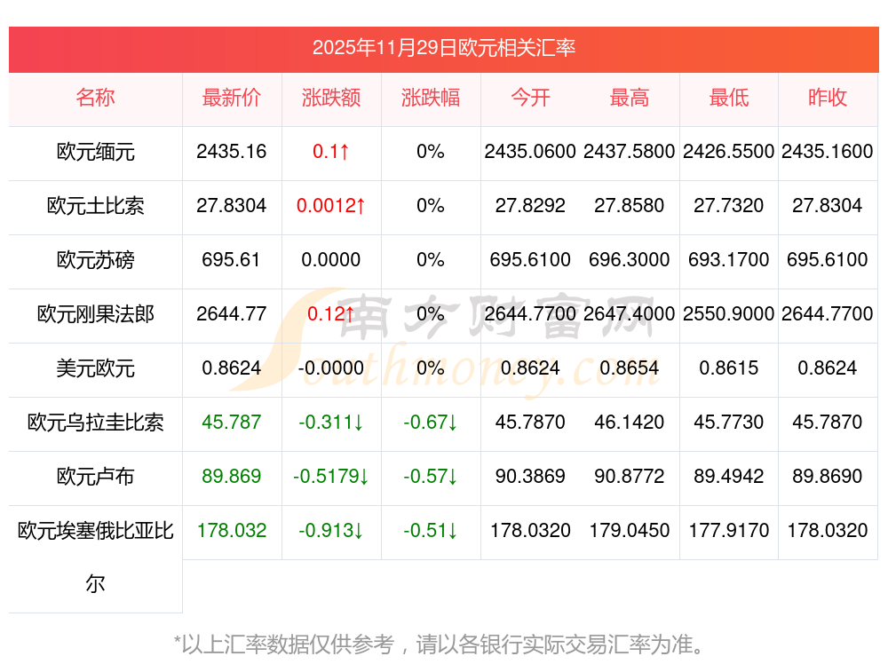 根據(jù)2025年11月29日匯率計(jì)算,EUR兌換BRL匯率最新價(jià)6.188500:今日開價(jià)6.2113,昨日收價(jià)6.1885,最高價(jià)6.2148,最低價(jià)6.1621。