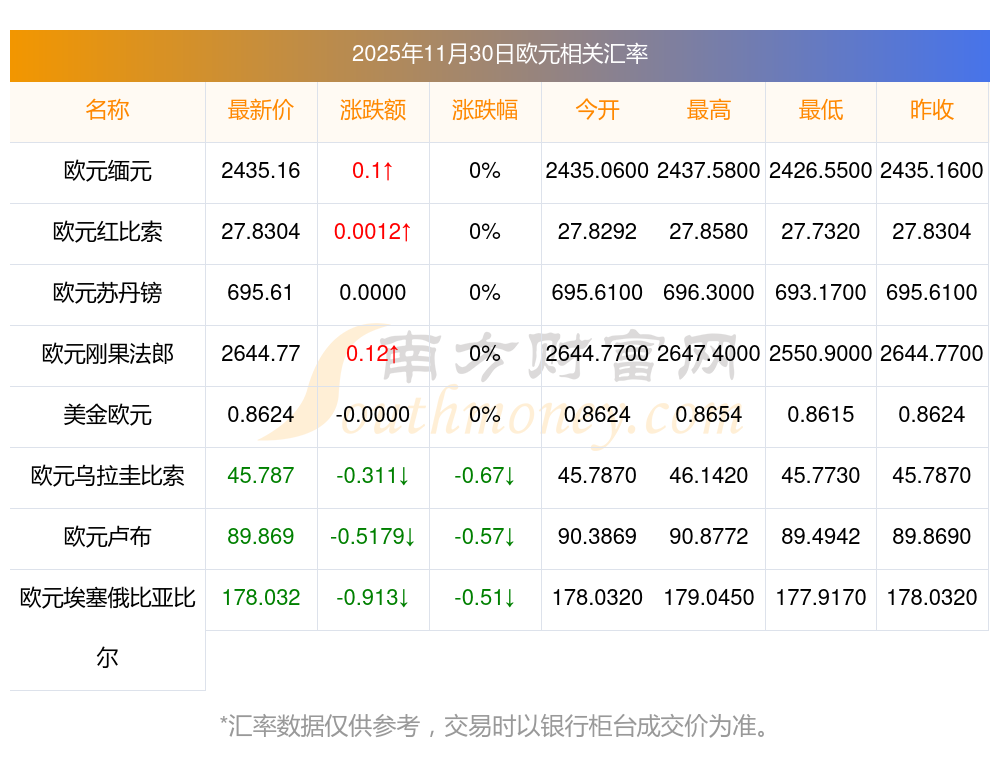 根據(jù)2025年11月30日匯率,歐元兌換福林匯率最新381.590000,今開381.5900,昨收381.5900,最高382.0300,最低381.0500。