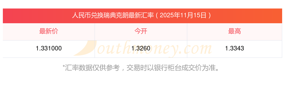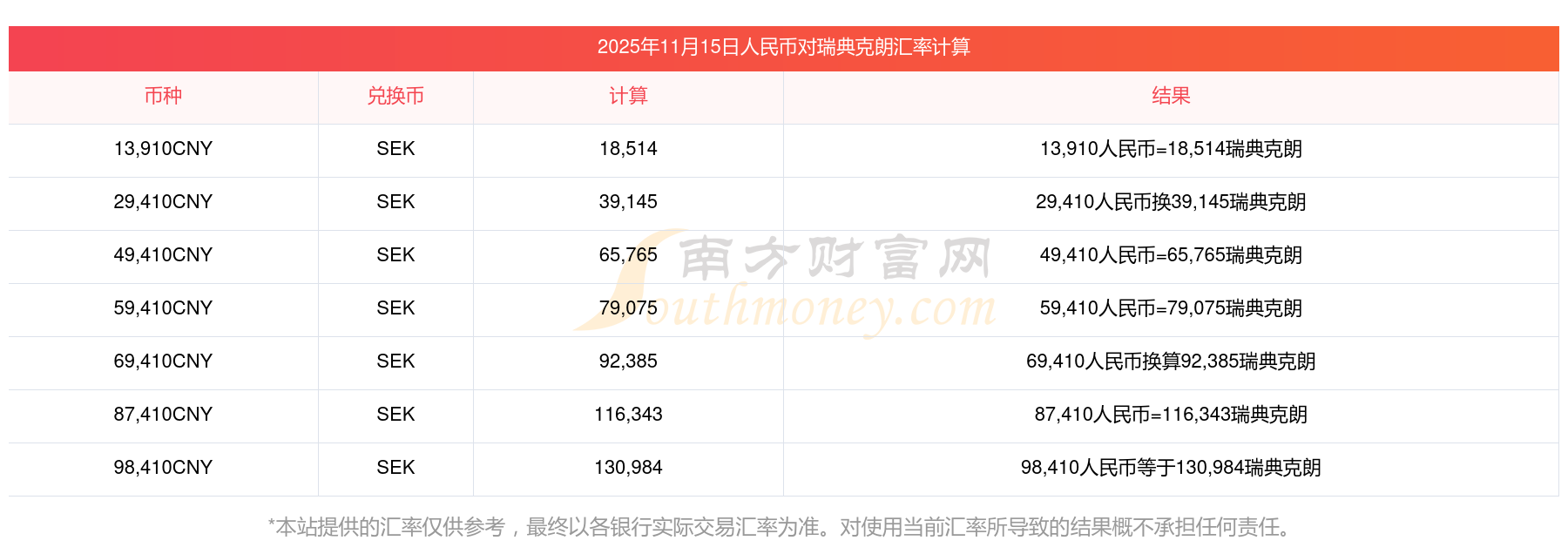 今日人民幣匯價(jià):2025年11月15日39人民幣兌瑞典克朗匯價(jià)一覽表