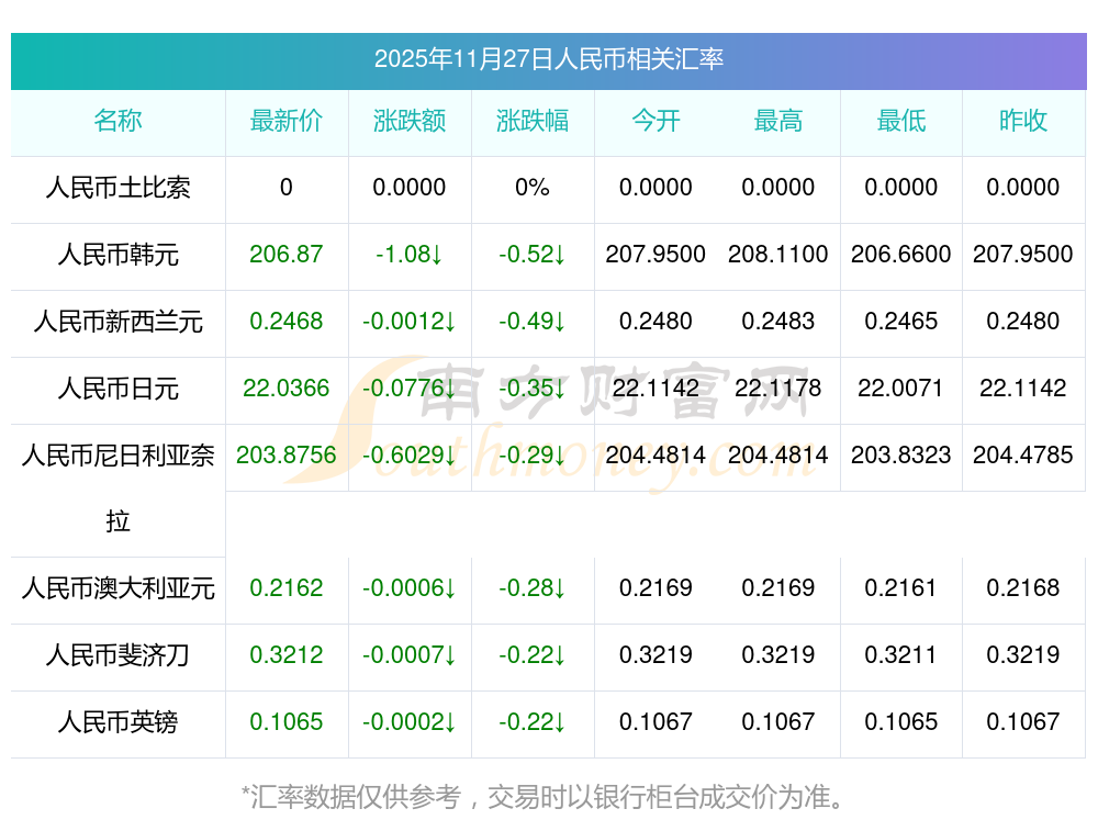 根據(jù)2025年11月27日匯率,人民幣兌換盧布匯率最新價11.087900,今開價11.0948,昨收價11.0939,最高價11.0948,最低價11.0866。