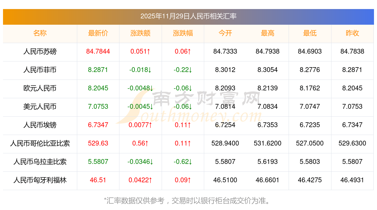 根據(jù)2025年11月29日匯率計(jì)算,人民幣兌換蘭幣匯率最新價(jià)2.419000,今開價(jià)2.4190,昨收價(jià)2.4190,最高價(jià)2.4292,最低價(jià)2.4153。