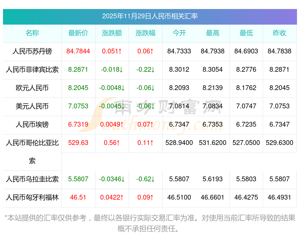 根據(jù)今天2025年11月29日匯率計(jì)算,CNY兌換SDG匯率最新價(jià)84.784391,今開價(jià)84.7333,昨收價(jià)84.7838,最高價(jià)84.7938,最低價(jià)84.6903。