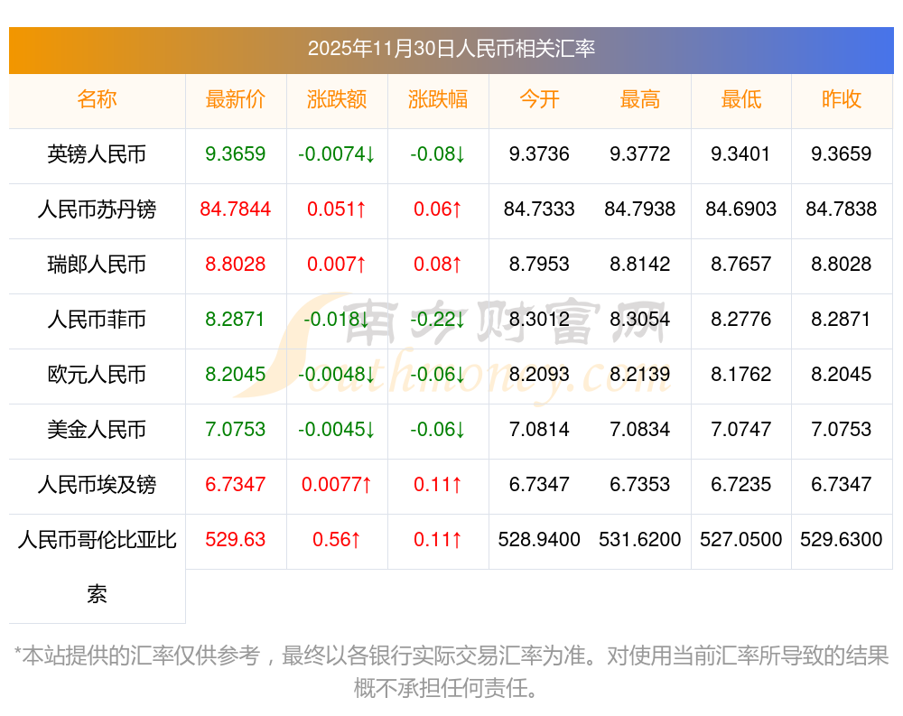 2025年11月30日人民幣相關(guān)匯率查詢(xún)