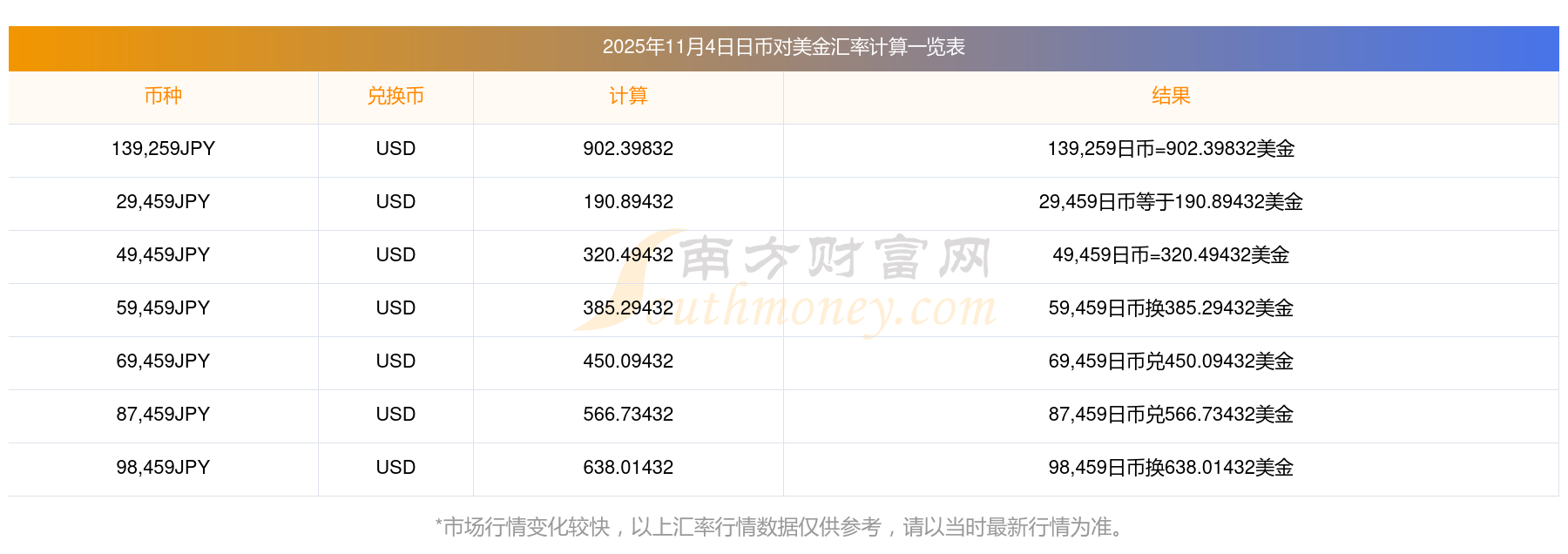 南方財(cái)富網(wǎng)為您提供日幣對(duì)美金匯率最新價(jià)格詳情。