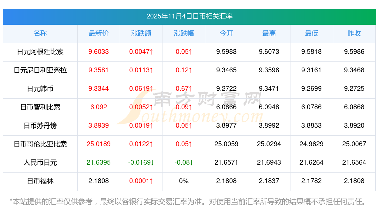 2025年11月4日日幣相關(guān)匯率查詢