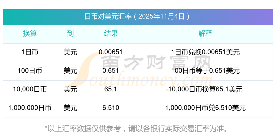 2025年11月4日日幣對美元的匯率為:0.00651