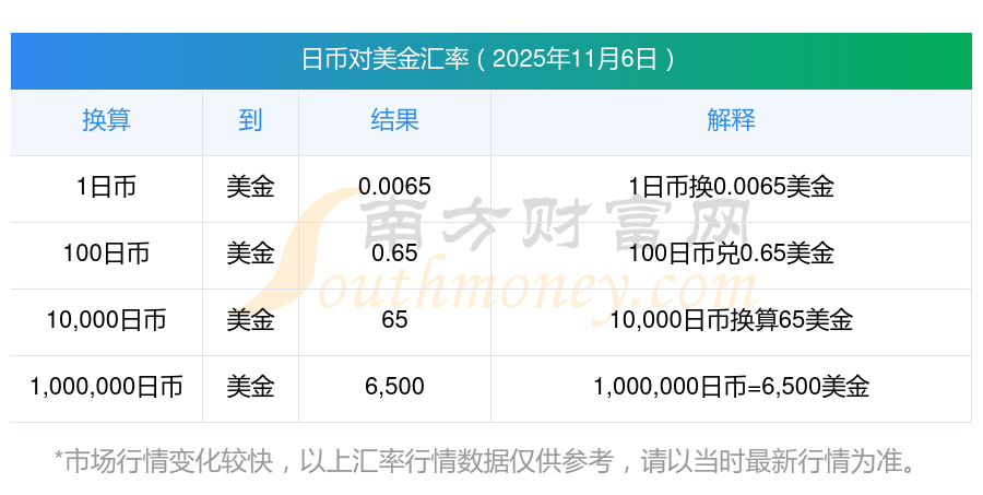 南方財(cái)富網(wǎng)為您提供日幣對美金匯率最新價(jià)格詳情。