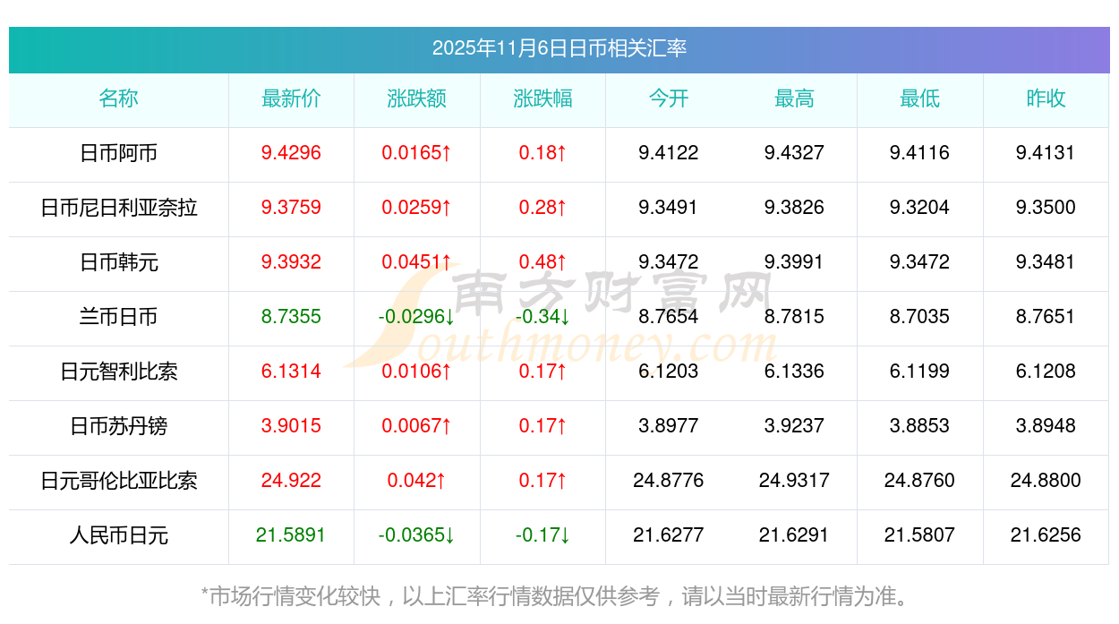 2025年11月6日日幣相關匯率查詢