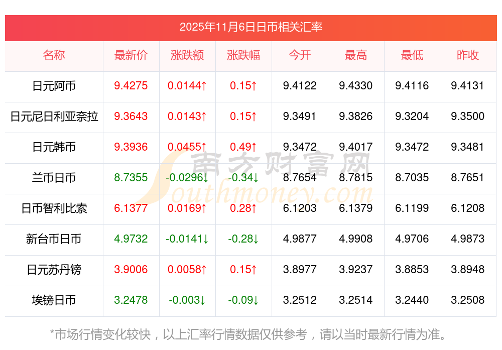 2025年11月6日最新消息,日幣兌換瑞郎最新匯率為0.005260,今開為0.0053,昨收為0.0053,最高為0.0053,最低為0.0053。