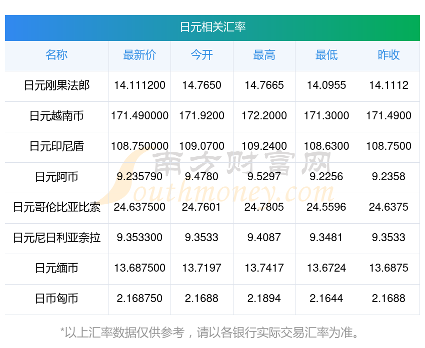 2025年11月9日日元相關(guān)匯率查詢