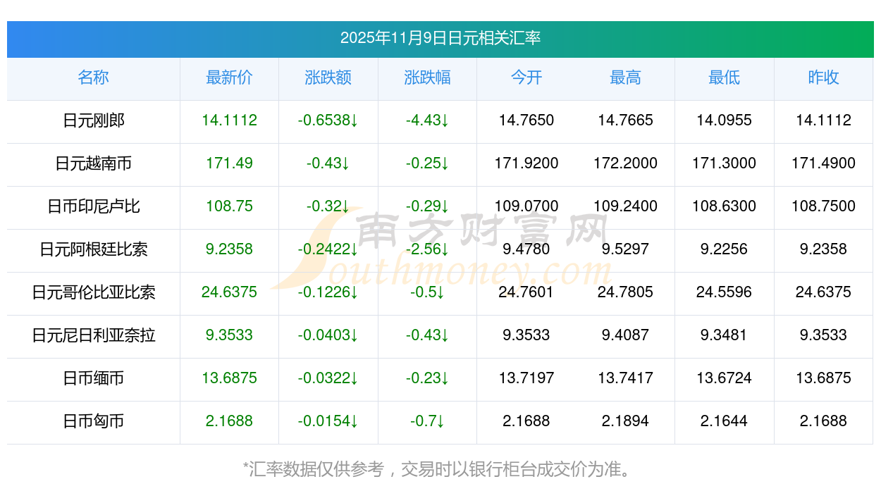 2025年11月9日最新消息,日元兌換剛郎最新匯率為14.111200,今開為14.7650,昨收為14.1112,最高為14.7665,最低為14.0955。