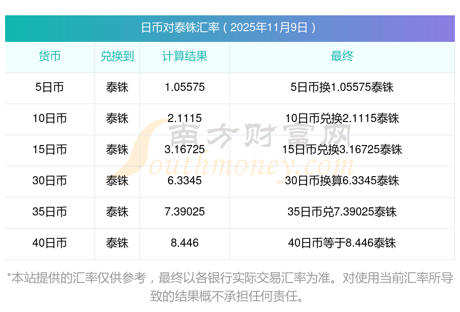匯率查詢,日幣兌換泰銖匯率查詢一覽表(2025年11月9日)