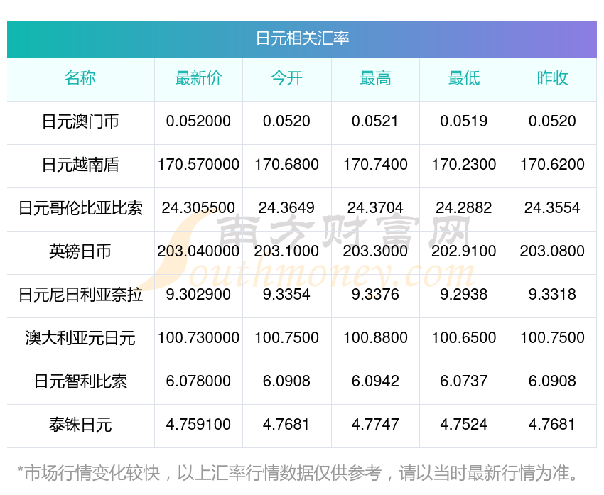 南方財富網(wǎng)為您提供日元對澳門幣匯率最新價格詳情。