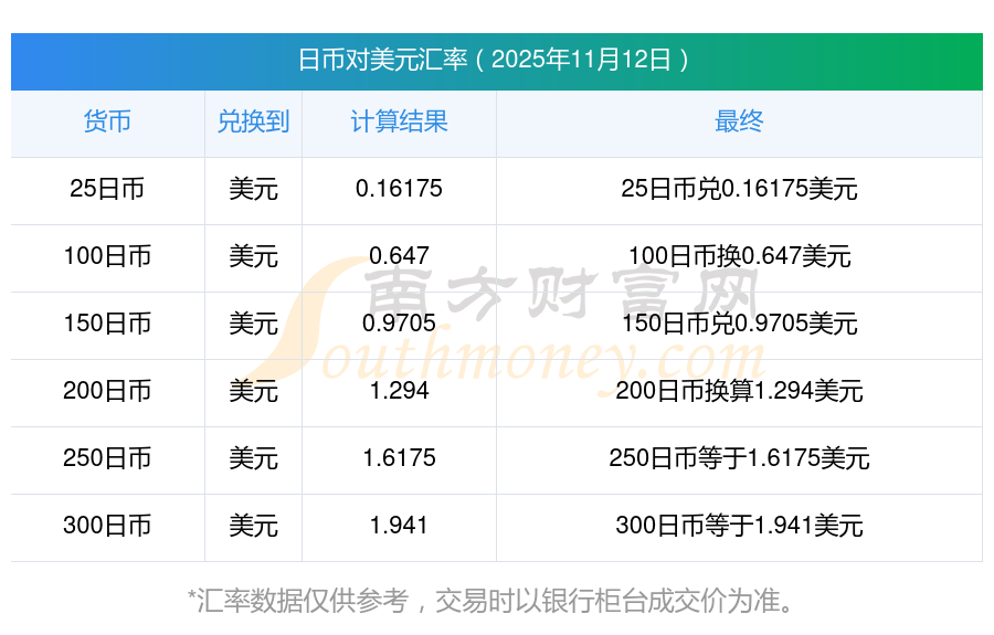 2025年11月12日今天匯率,換算日幣(JPY)到美元(USD):