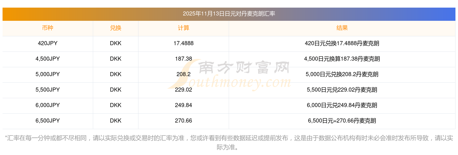 今天日元新行情:日元對(duì)丹麥克朗匯率行情2025/11/13