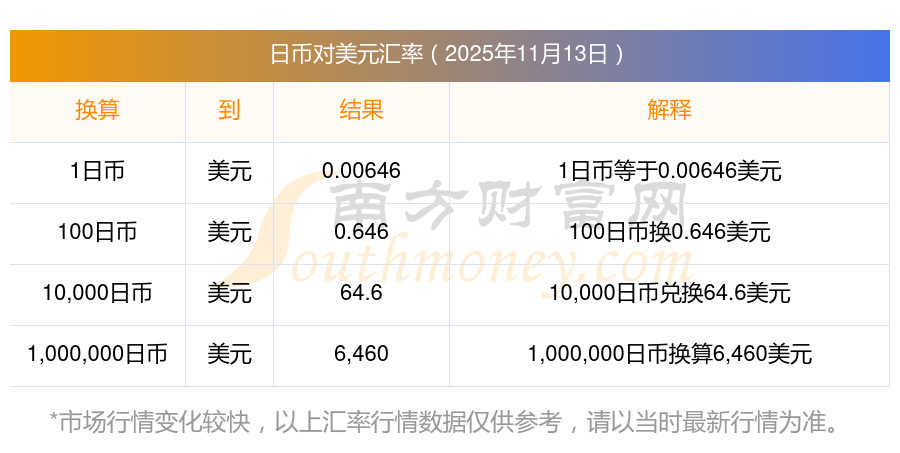 南方財(cái)富網(wǎng)為您提供日幣對(duì)美元匯率最新價(jià)格詳情。