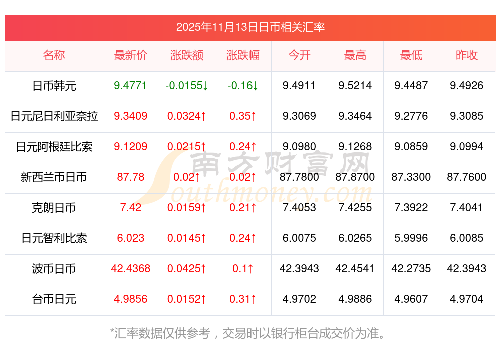 2025年11月13日日幣相關(guān)匯率查詢