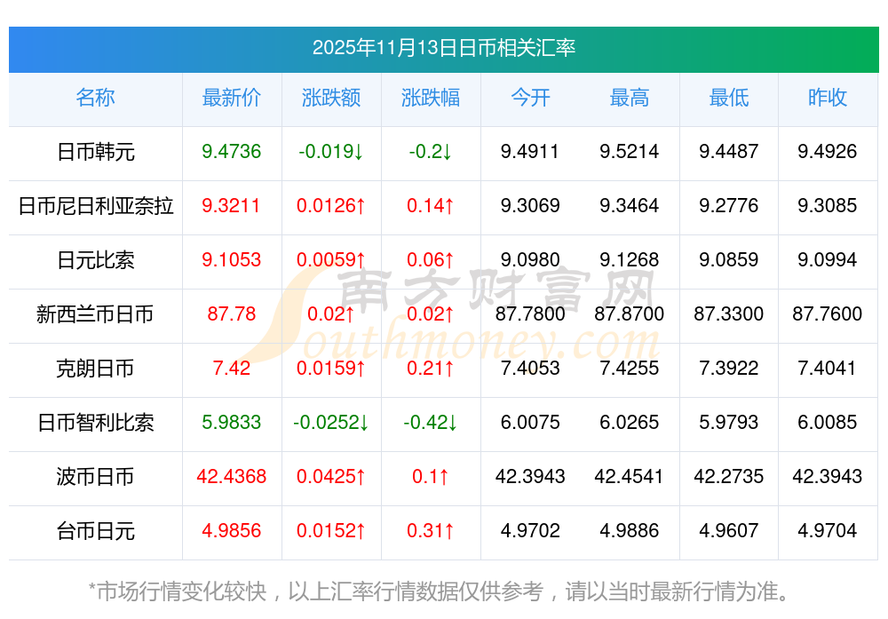 2025年11月13日日幣相關(guān)匯率查詢