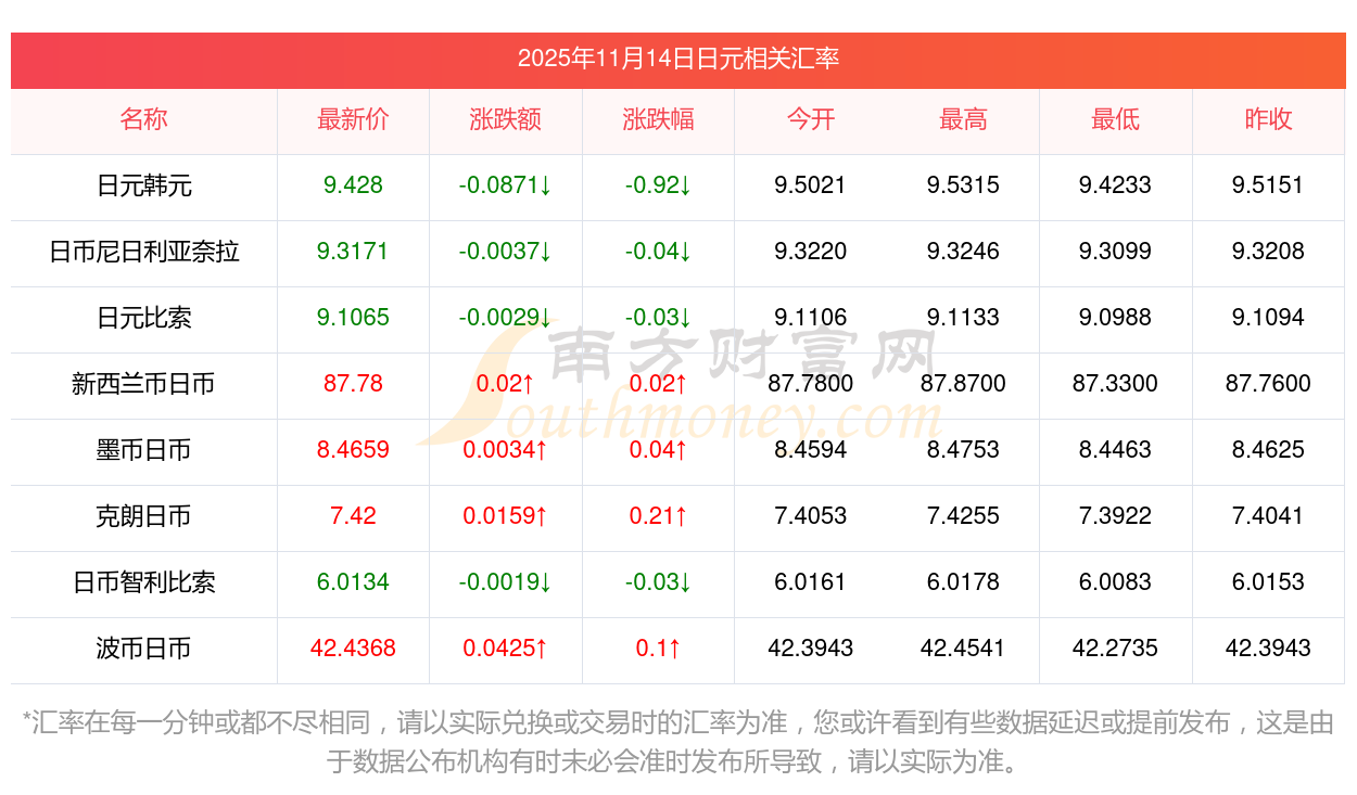 根據(jù)2025年11月14日匯率,日元兌換菲幣匯率最新0.381400,今開0.3814,昨收0.3813,最高0.3817,最低0.3809。