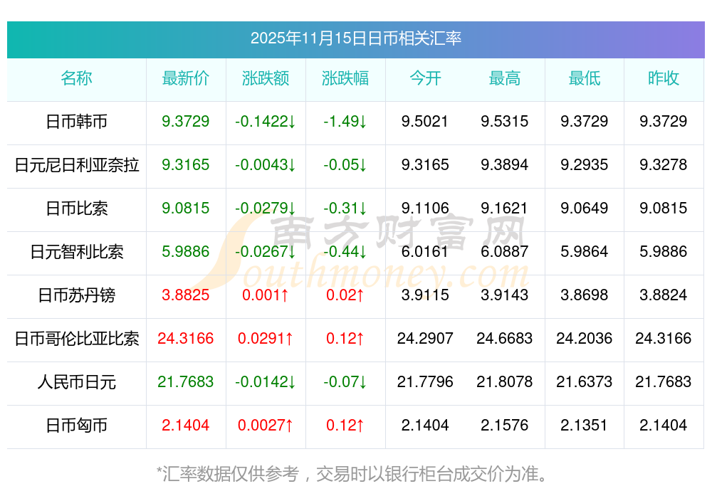 2025年11月15日日幣相關匯率查詢