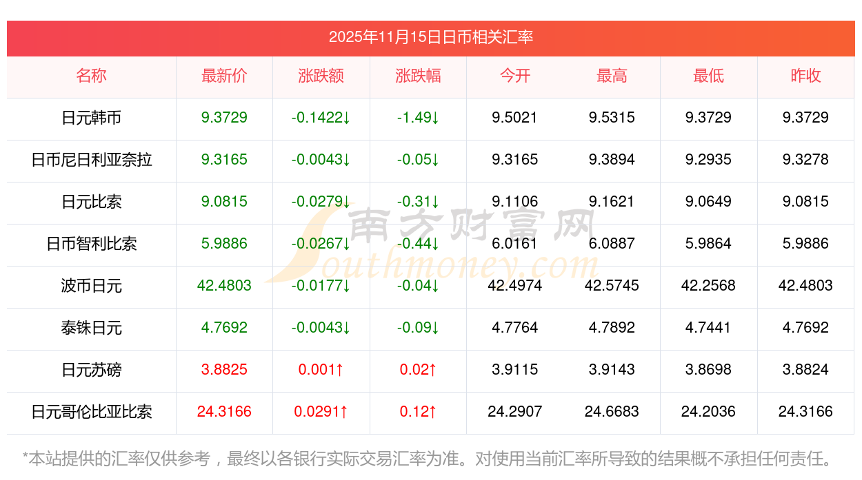 2025年11月15日日幣相關(guān)匯率查詢
