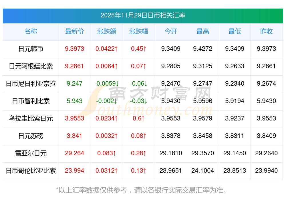根據(jù)今天2025年11月29日匯率計(jì)算,JPY兌換COP匯率最新價(jià)23.994000,今開(kāi)價(jià)23.9651,昨收價(jià)23.9940,最高價(jià)24.1004,最低價(jià)23.8513。