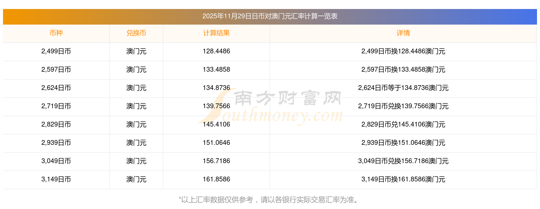 2025年11月29日日幣對(duì)澳門(mén)元匯率計(jì)算