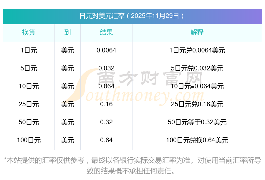 本站提供的匯率僅供參考,最終以各銀行實(shí)際交易匯率為準(zhǔn)。對使用當(dāng)前匯率所導(dǎo)致的結(jié)果概不承擔(dān)任何責(zé)任。