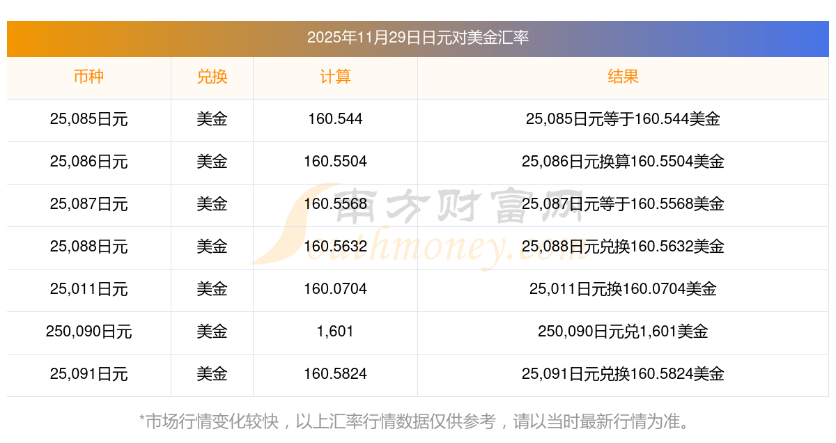 2025年11月29日日元與美金的兌換匯率計算如下: