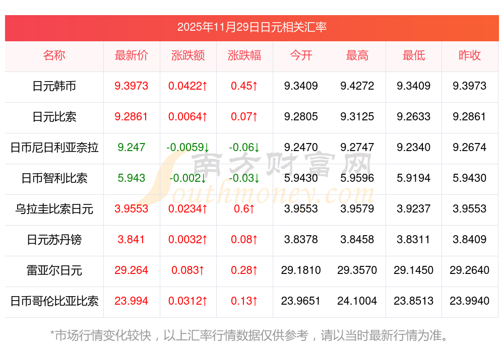 2025年11月29日日元兌換歐元最新匯率:0.005522,今開:0.0055,昨收:0.0055,最高:0.0055,最低:0.0055。