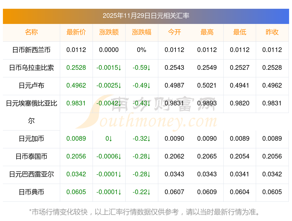 根據(jù)2025年11月29日匯率,日元兌換韓幣匯率最新價9.397300,今開價9.3409,昨收價9.3973,最高價9.4272,最低價9.3409。